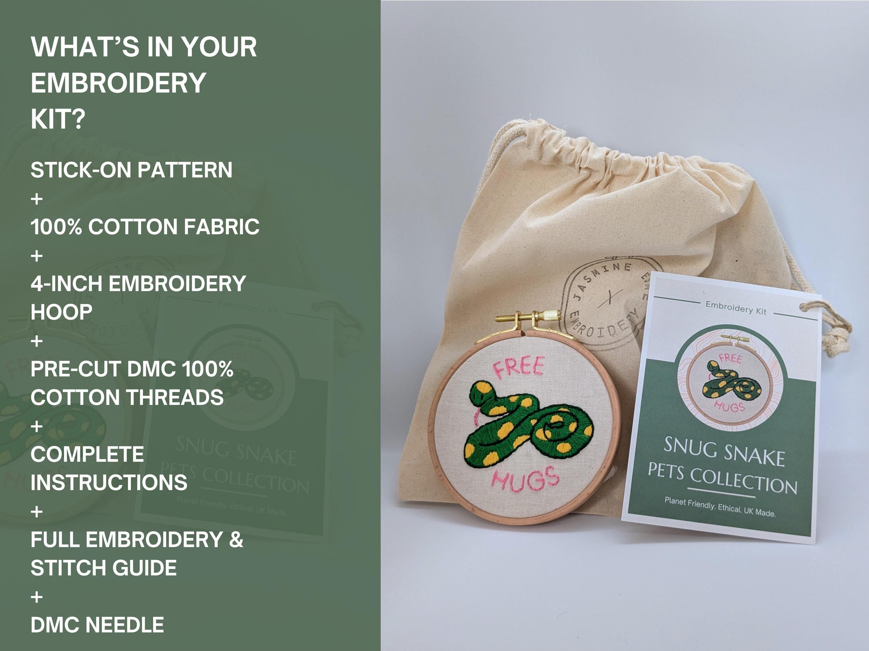 Free Hugs is part of the pets collection hand embroidery kits. This one is of course about our most misrepresented friends - snakes. PSA: not all snakes are venomous cobra's! This cuddly snuggly snake aims to remind us of that. I hope you love this completing this kit as much as I enjoyed designing it! Stitch your own version to hang in your home.