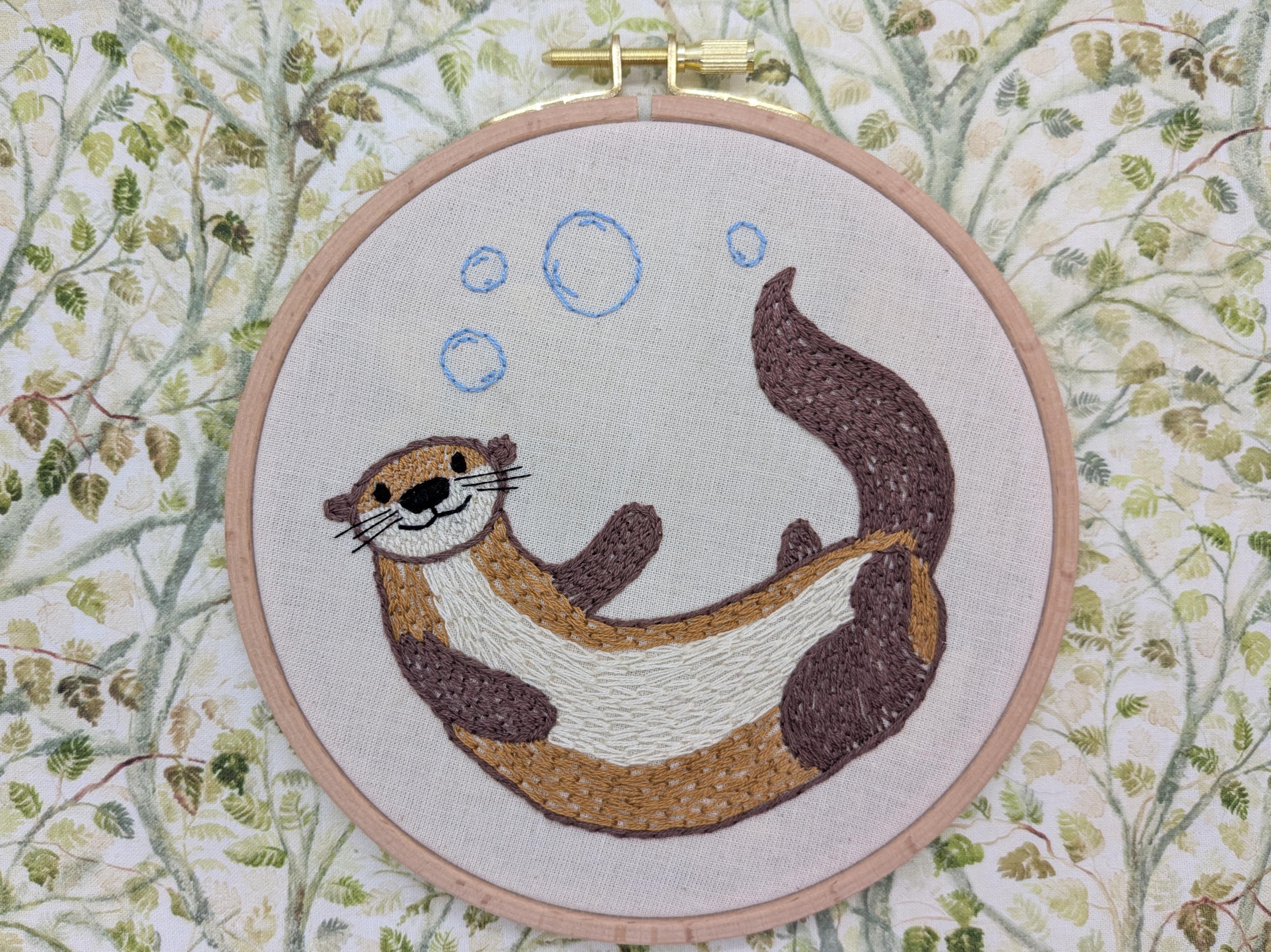 OTIS THE OTTER is part of my Scottish Creatures collection. Otters live in lochs, rivers, and along the coastline of Scotland. They were once almost extinct but have been reintroduced and are thriving nowadays. They have even been spotted in rivers in Edinburgh and Glasgow! This embroidery pattern shows Otis, a cute otter, swimming on his back surrounded by bubbles.