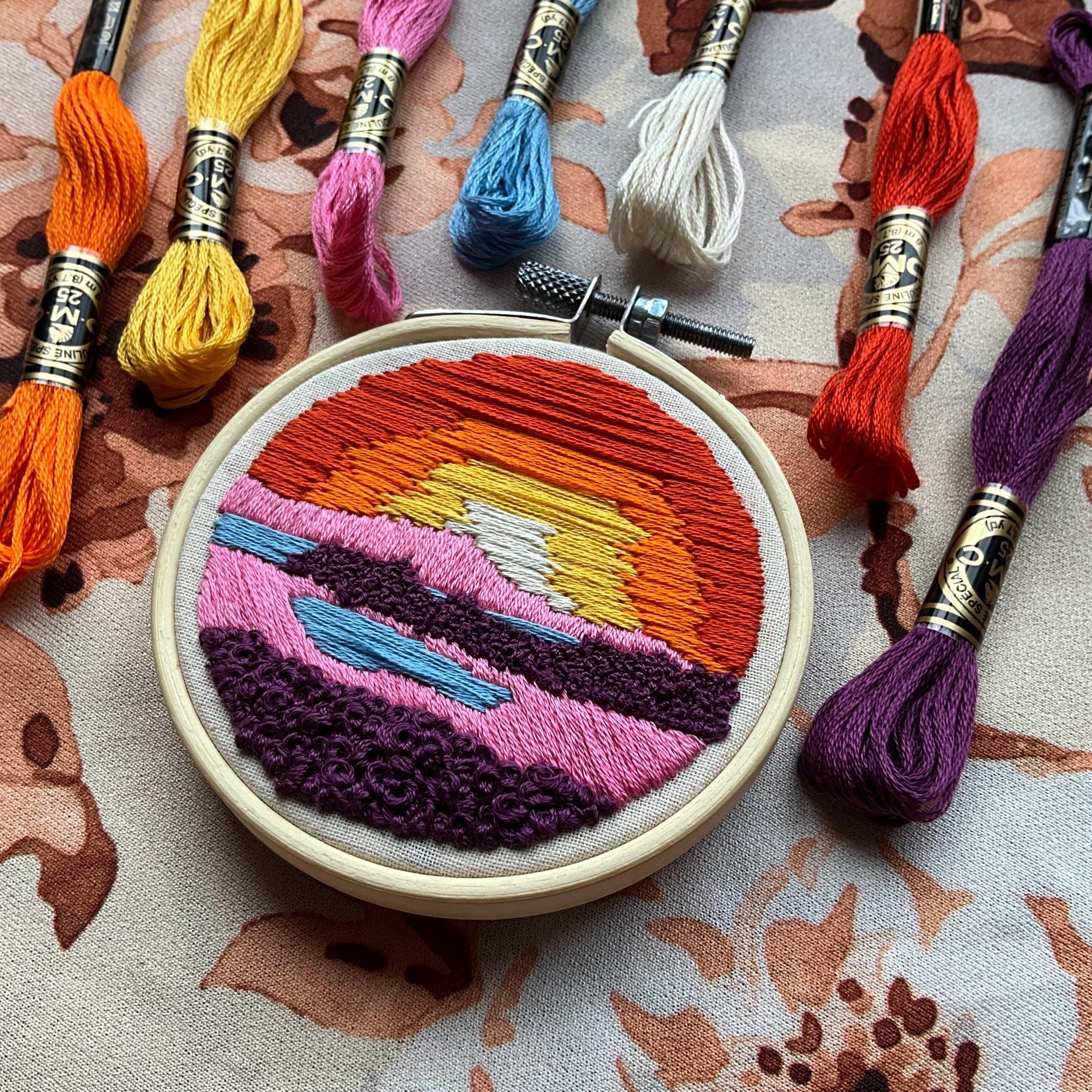 Bothy on the Green, Sheep of Luib, Sunset over Loch, Orange Munro, and Sunrise on Heather are the 5 embroidery patterns making up my original Scottish Landscapes series. Living in Scotland means endless beautiful sights and scenery varying from the rugged Outer Hebrides to quiet lochs in the highlands and beautiful fields in the lowlands. I have been lucky to recently travel around my country quite a bit. These five embroidery pieces have varying inspirations from the Isle of Skye to the famous Loch Ness (yes, she is real! And she doesn’t like to be called a monster!). Each of these patterns are available separately, but with this bundle you get all five for the price of two! If you would like to get a physical version of these patterns with all the materials provided, click through to my Etsy shop and you will find the option to do that there.